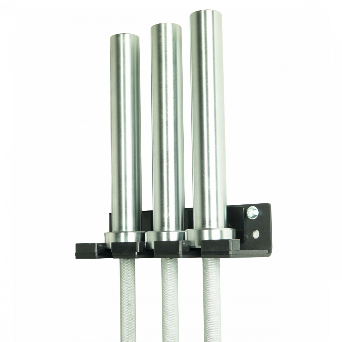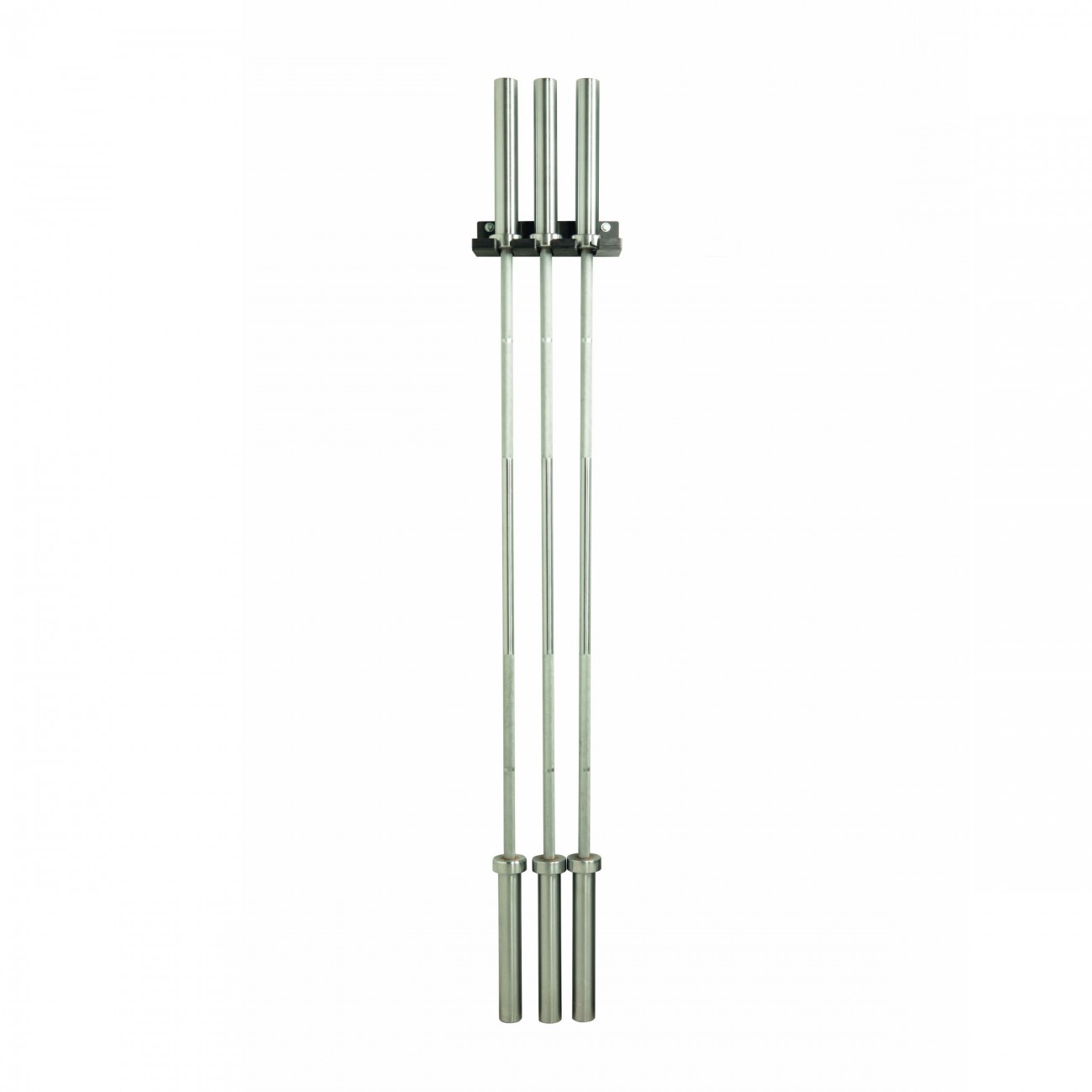 Wall mount for stainless steel Olympic bars. Suitable for three Olympic bars. Comfort, safety and great resistance. Easy to place and assemble.