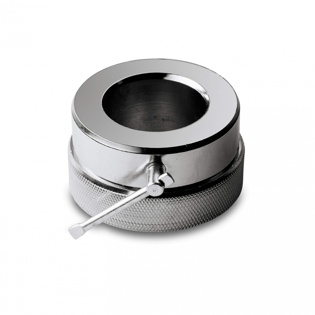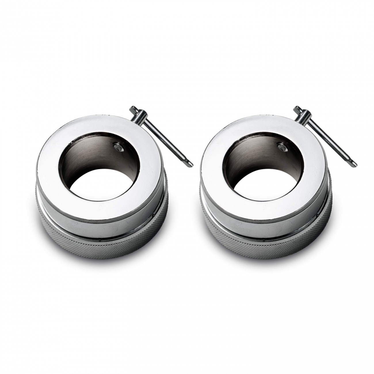Highest quality and resistant steel collar for Olympic competition bars. Weight 2.5 kg each. Quick, comfortable, safe and stable disc change. Efficient and safe locking stop system. Interior part with materials that protect the bars from damage.