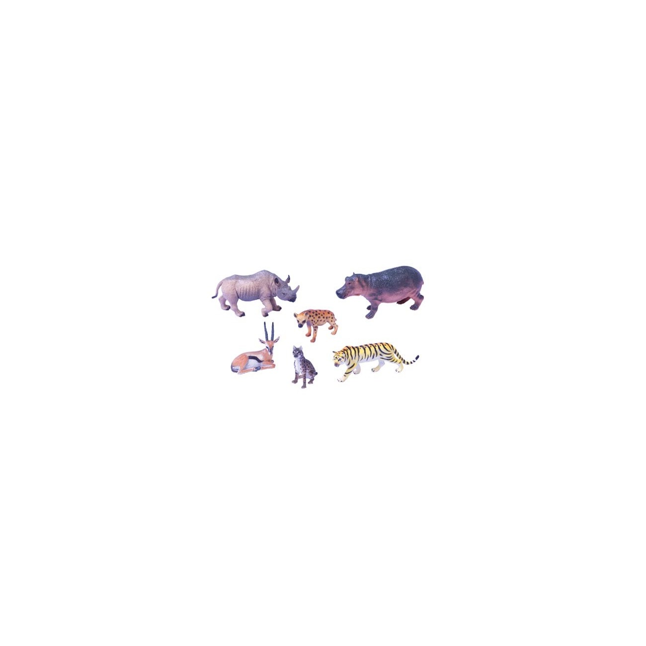 Tiger, rhinoceros, hippopotamus, hyena, gazelles and lynx.