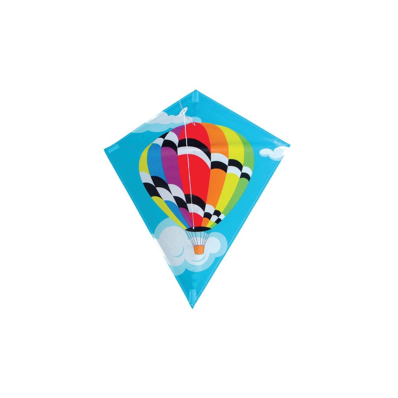 Diamond balloon kite. Fiber rods and nylon fabric. Measurements: 75 x 45 cm. Nylon thread with handle. Up to 6 years.