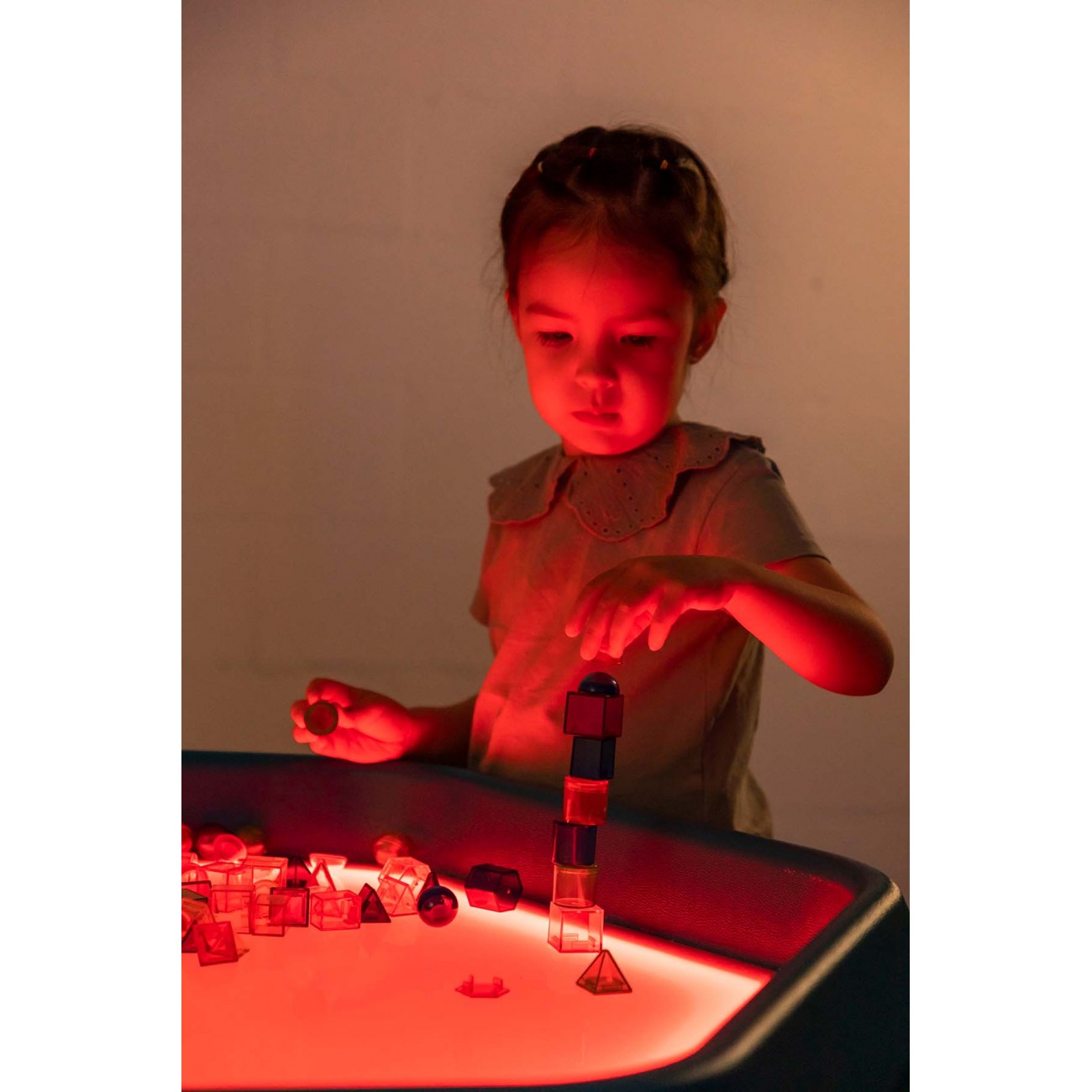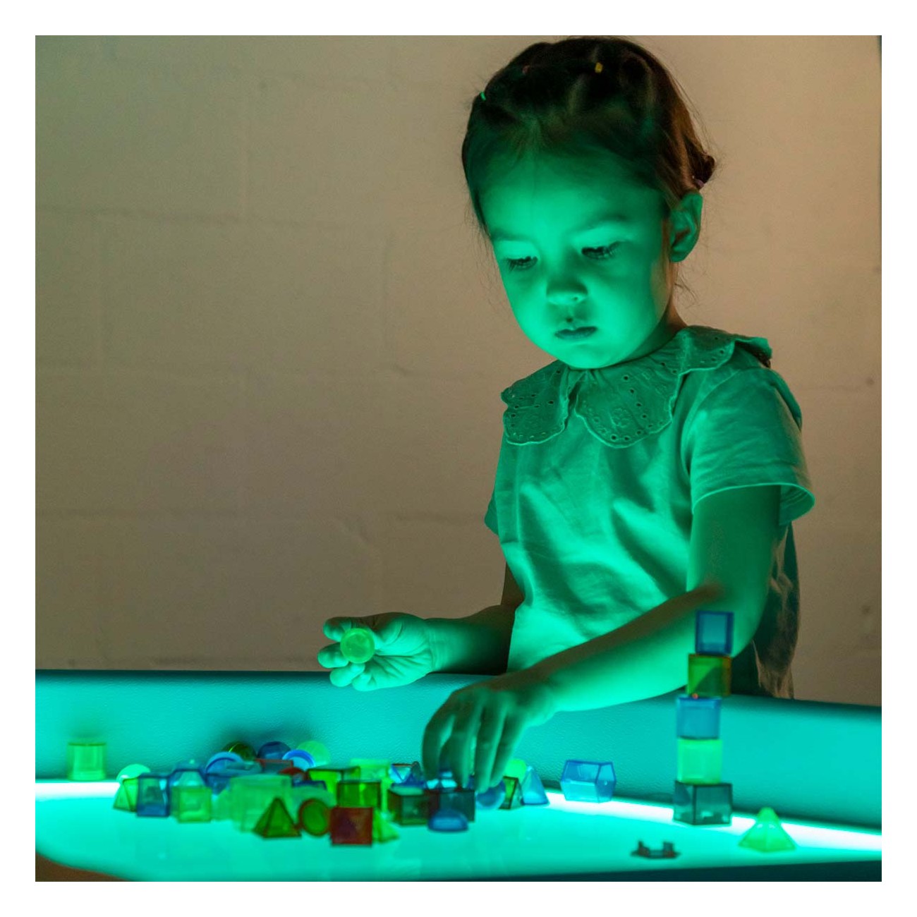 3D translucent geometric shapes learning set. This set includes a variety of geometric shapes, from cubes and rectangles to pentagonal prism and cone, all designed for stacking and creating imaginative structures. The translucent pieces are not only visually appealing, but are also ideal for use on the light table, allowing children to explore and experiment with light and shadow children to explore and experiment with light and shadow as they build and play. With this set, development of fine motor skills, shape recognition and spatial concepts are encouraged while children have fun and learn. Ideal for the light table and perfect for exploring the world of shapes and colors.