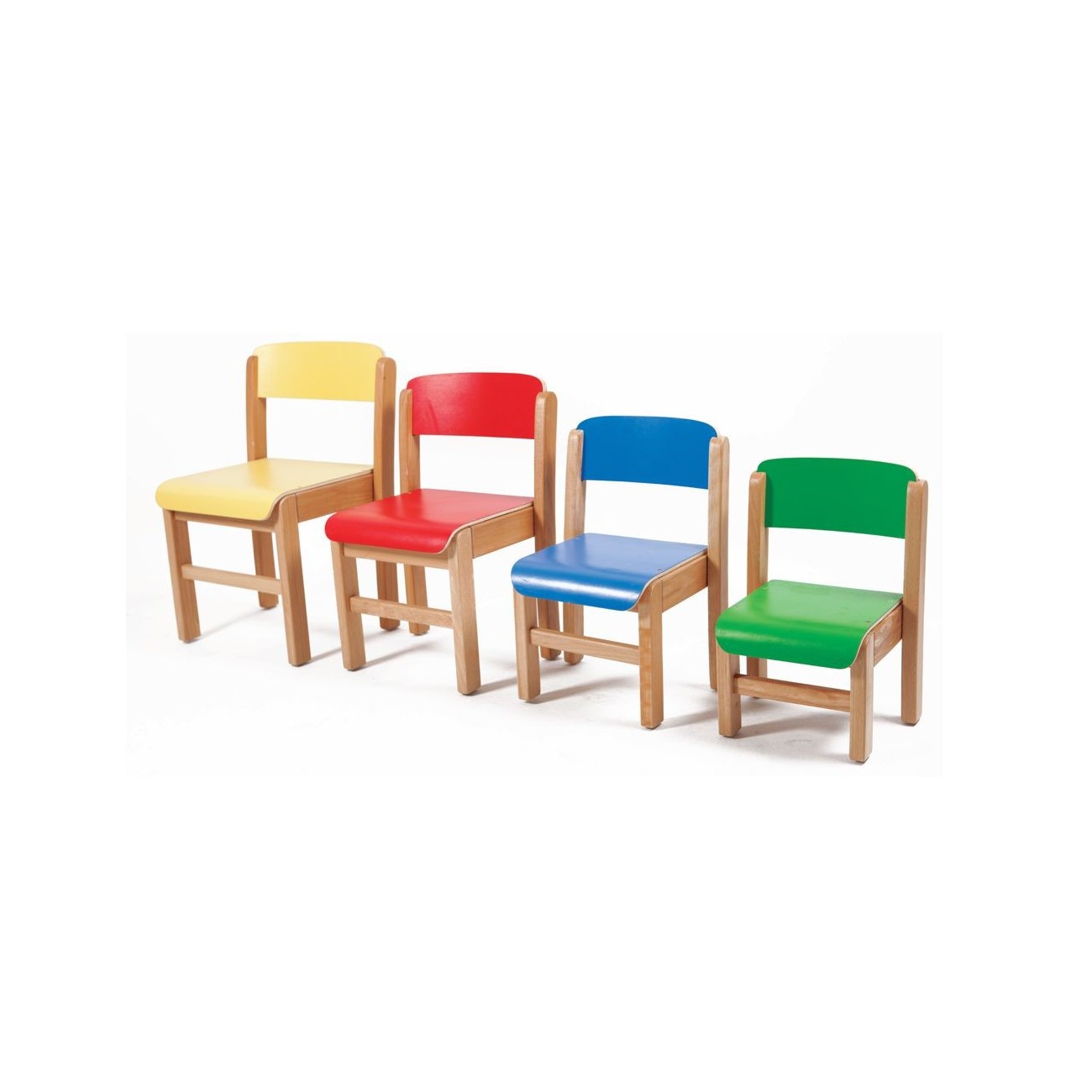 Made with solid beechwood high quality and varnished. Seat with ergonomic back made in stratified wood 9mm thick very resistant. Safety rounded edges.Curved rear legs for avoiding fall down. High quality finishing. Different colors, Natural wood, blue , red, green and yellow. Possible to pill up. Comply UNE-EN 1729-1: 2007
