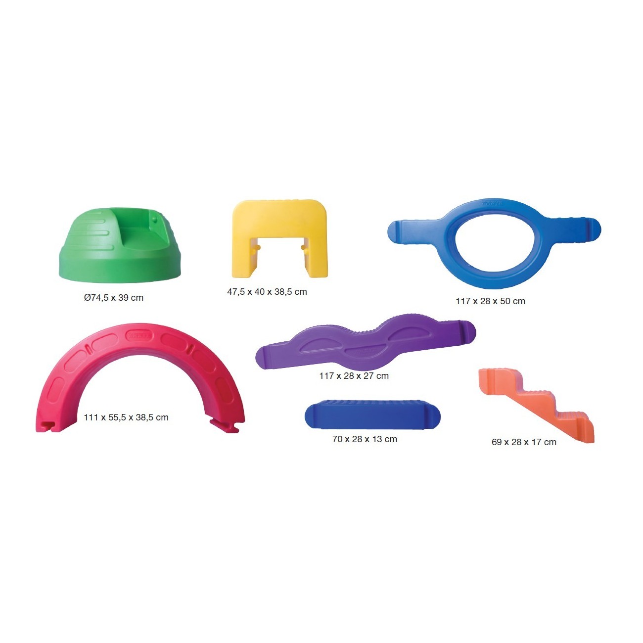 Made with rotational molding system with materials approved by the European Union, under IN-71 standards. Each piece has a different surface: lines, dots, circles, waves, charts, etc ... This allows the realization of tactile recognition exercises.