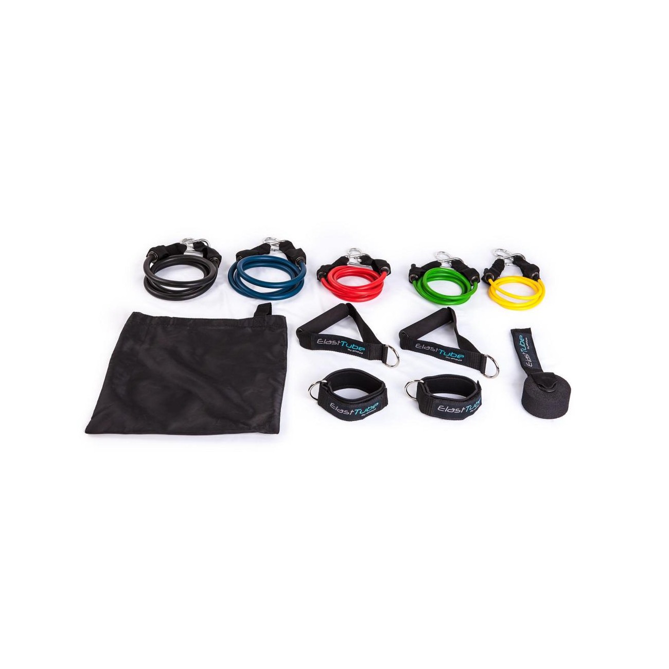 Resistance band kit. Includes 2 ankle grips, 2 hand grips and 5 elastics of several resistance.