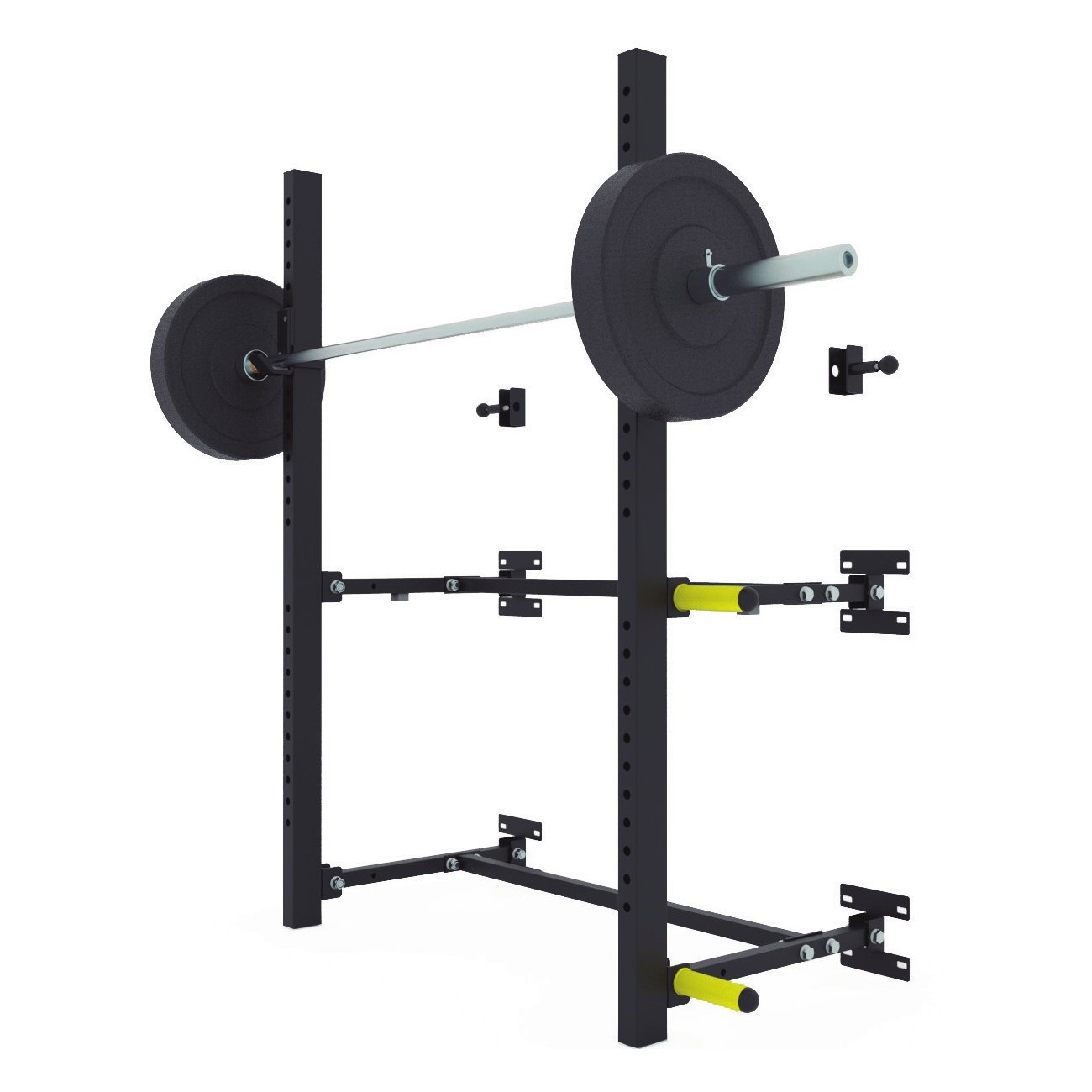 Foldable Wall-Mounted Squat Rack, the best option for garage gyms and training centers where saving space is essential. Highly stable and equipped with safety systems, it is made of steel tubing and ideal for exercises such as squats and bench press.
