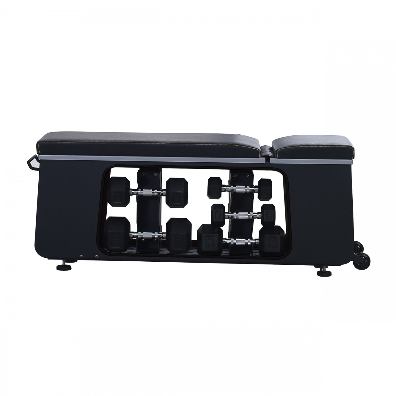 Efficient storage: four storage compartments; two sides for dumbbells and two at the ends for other equipment such as kettlebells, elastics, balls and ropes.