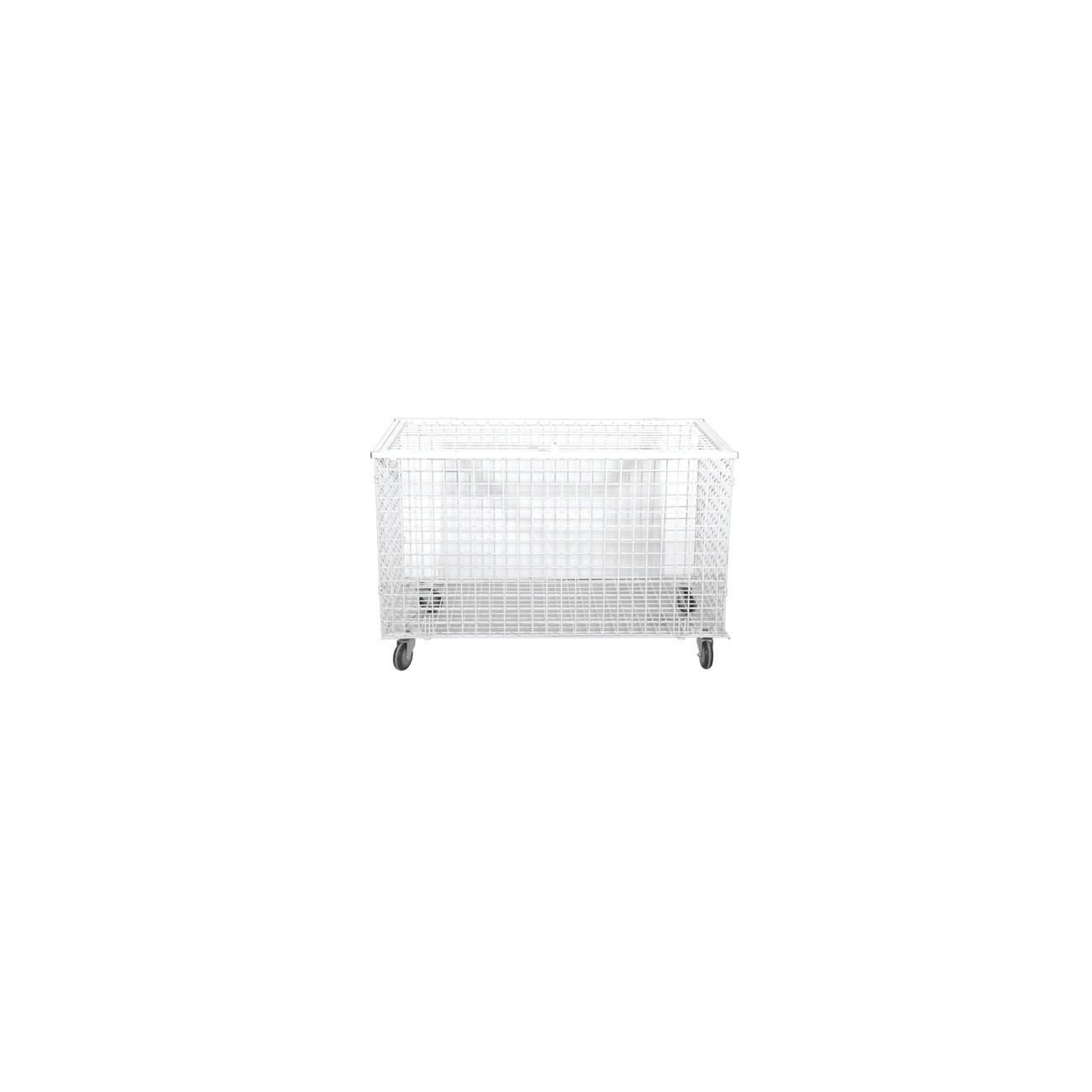 The welded steel mesh (50 × 50 mm, 5 mm diameter) ensures excellent ventilation and visibility of contents, while the anti-corrosion treatment protects the trolley in humid or intensive-use environments.