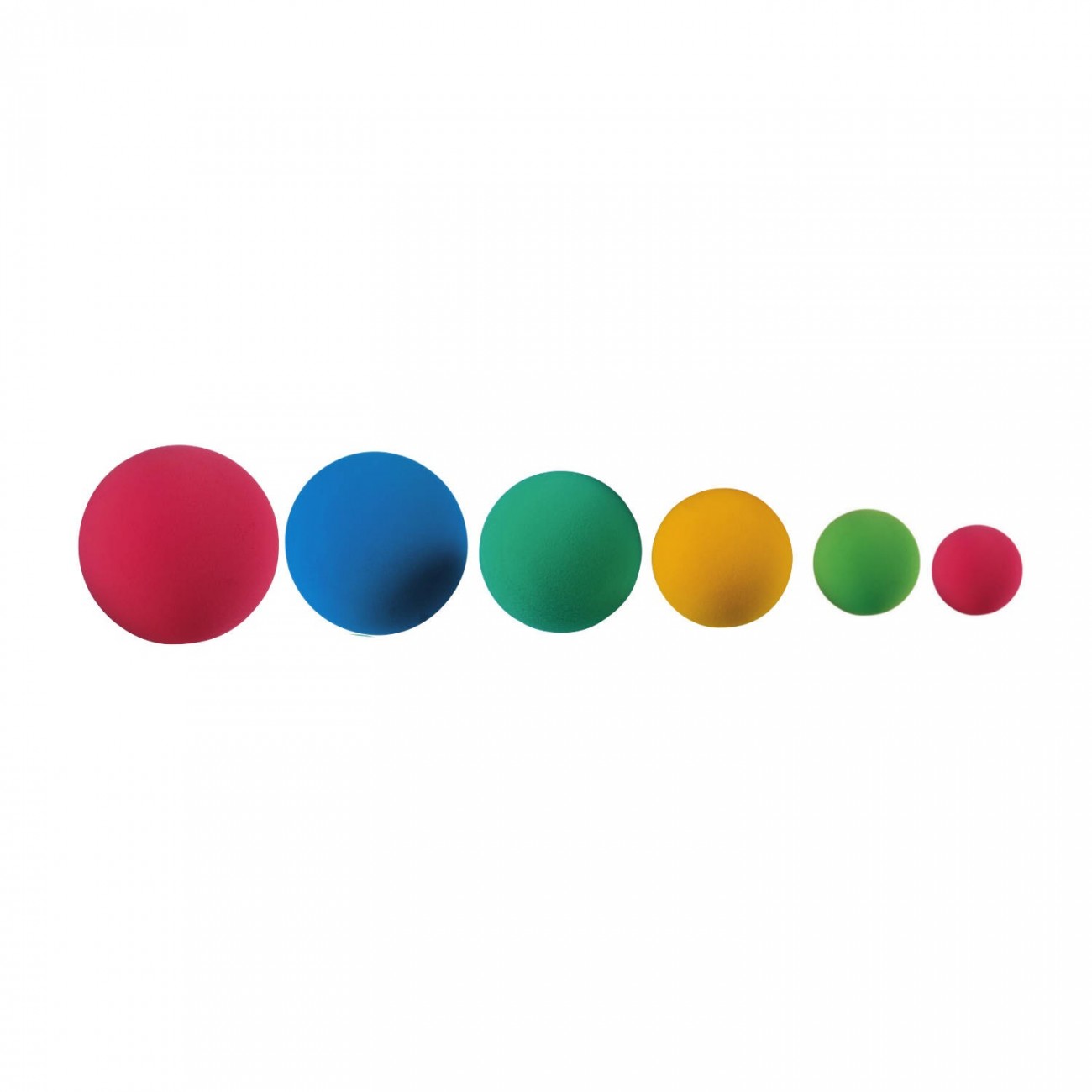Pelotas de foam de poliuretano (PU) ligeras, blandas y seguras, ideales para juegos escolares, actividades motrices, iniciación deportiva y psicomotricidad. Disponibles en 6 tamaños diferentes, desde 70 mm hasta 210 mm de diámetro, y en colores llamativos: rojo, azul, verde y amarillo.