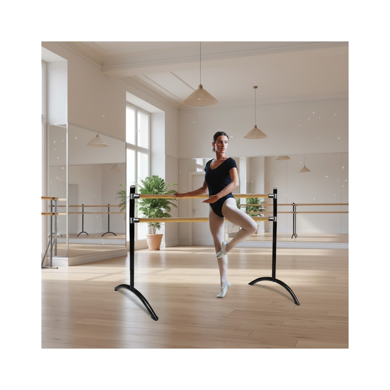 Estructura portátil, ligera y resistente, ideal para la práctica de ballet, danza, estiramientos y entrenamientos de fuerza. Dispone de dos barras paralelas de fácil ajuste en altura, lo que la hace adecuada para todas las edades y niveles.